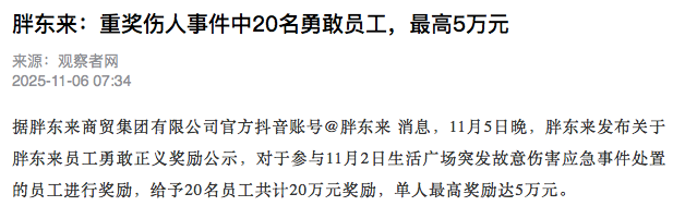据胖东来商贸集团有限公司官方抖音账号“@胖东来”消息,11月5日晚,胖东来发布关于胖东来员工勇敢正义奖励公示,对于参与11月2日生活广场突发故意伤害应急事件处置的员工进行奖励,给予20名员工共计20万元奖励,单人最高奖励达5万元。