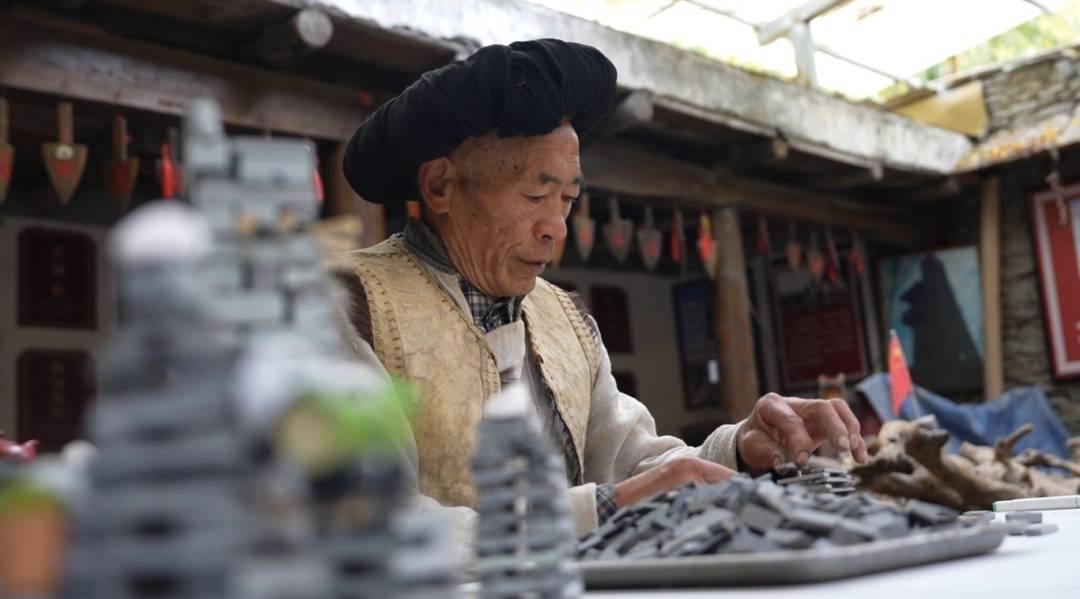 跨过斑驳古朴的老旧门槛,院落里鳞次栉比的微型石碉楼摆件格外吸睛。头戴黑色头帕、身着白色大褂的贾学友老人端坐其间,面对各式手作碉楼物件,如数家珍、娓娓道来,细细讲述羌族碉楼营造技艺的千年底蕴。作为当地资深羌族手艺人,老人坚守古法技艺多年。羌族传统碉楼以山石、泥土为原料,沿用古老干砌技法,无需水泥铁钉、不用施工图纸,依靠代代相传的营造经验修筑而成,独特的营造工艺,镌刻着羌族千年人文记忆。随着现代建筑快速发展,传统手工技艺日渐边缘化,一度面临后继无人的传承难题。