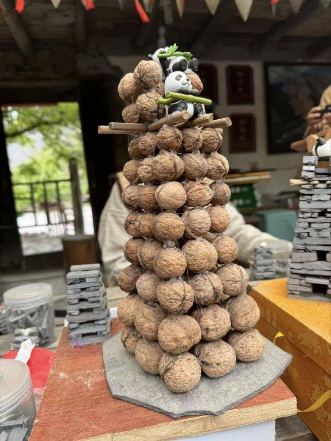 “最开始根本没想过专门传承非遗,偶然看到别的地方做微缩古建筑手工,我就想到我们羌寨的碉楼,才想着试着做一做。”贾学友老人的女儿杨天琼女士说,早年在电视节目中看到外地微缩古建筑手工案例,深受触动,由此立足桃坪羌寨特色,萌生打造微型碉楼的想法。最初就地取材,采用天然石头制作摆件,因石材笨重不便携带,想到理县本地的核桃优势,灵机一动,创新的改用核桃原料制作微型碉楼,既丰富文创品类,也为本地核桃拓宽销售路径,实现了非遗创意与农特产品增收双向赋能。